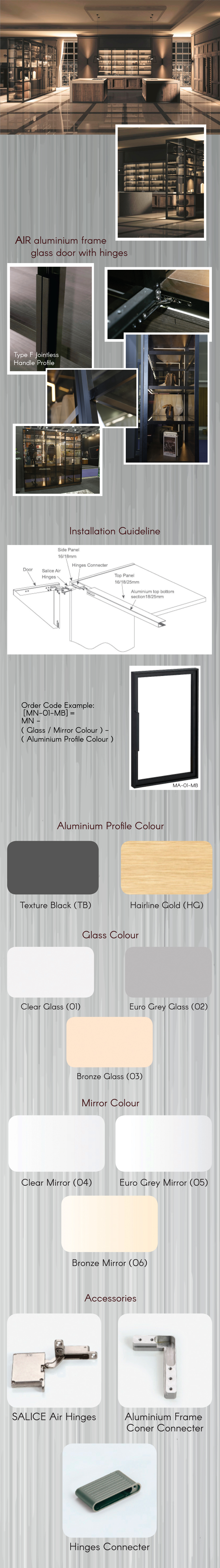 AIR is an Aluminium Glass Door system that comes with innovatively designed aluminium frame in different colour finished and side handles.